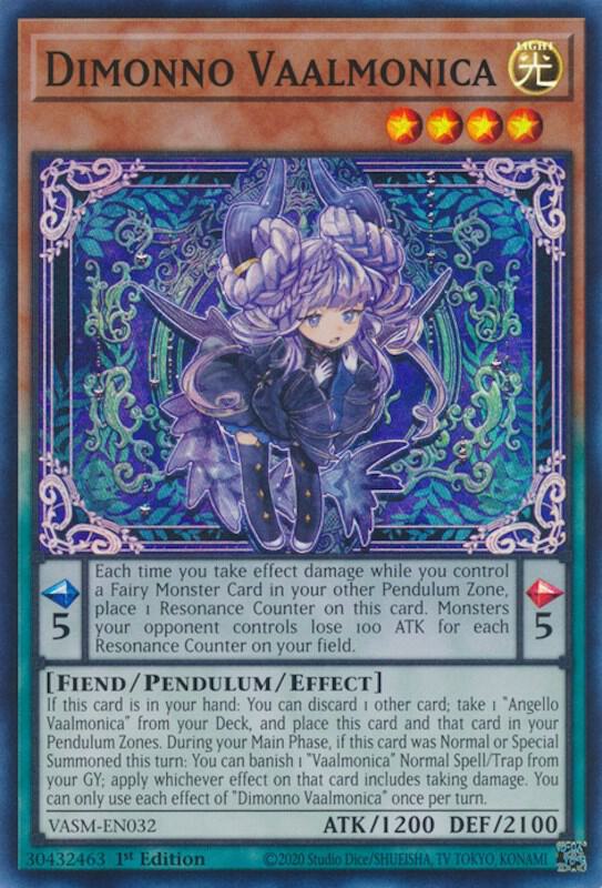 If this card is in your hand: You can discard 1 other card; take 1 "Angello Vaalmonica" from your Deck, and place this card and that card in your Pendulum Zones. During your Main Phase, if this card was Normal or Special Summoned this turn: You can banish 1 "Vaalmonica" Normal Spell/Trap from your GY; apply whichever effect on that card includes taking damage. You can only use each effect of "Dimonno Vaalmonica" once per turn.